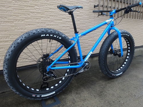 前後リジットのバイクでトレイルを走る感覚は「楽しい!」の一言に尽きます。どんなフィールドにも対応する走破性。MAXXIS マンモス 26×4,0タイヤを装着。TEKTRO油圧ブレーキを搭載しています。