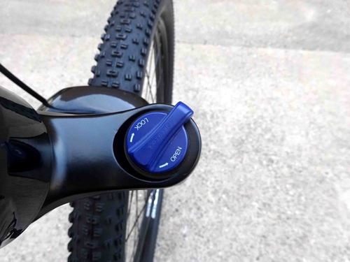100mmのトラベルを持ちハードなオフロードライドに対応します。剛性に優れた大径アルミボトムケース採用。油圧式のロックアウト機構付きで登りのパワーロスを防止します。